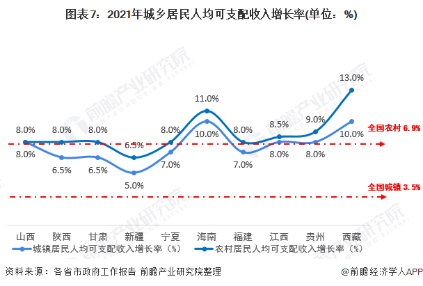2021年城乡居民人均可支配收入增长明显。2020年全国城镇居民人均可支配收入增长3.5%,农村居民人均可支配收入增长6.9%,与2020年全国城乡居民可支配收入增长率相比, 2021年代表性省份城镇及农村目标均超过全国水平。
